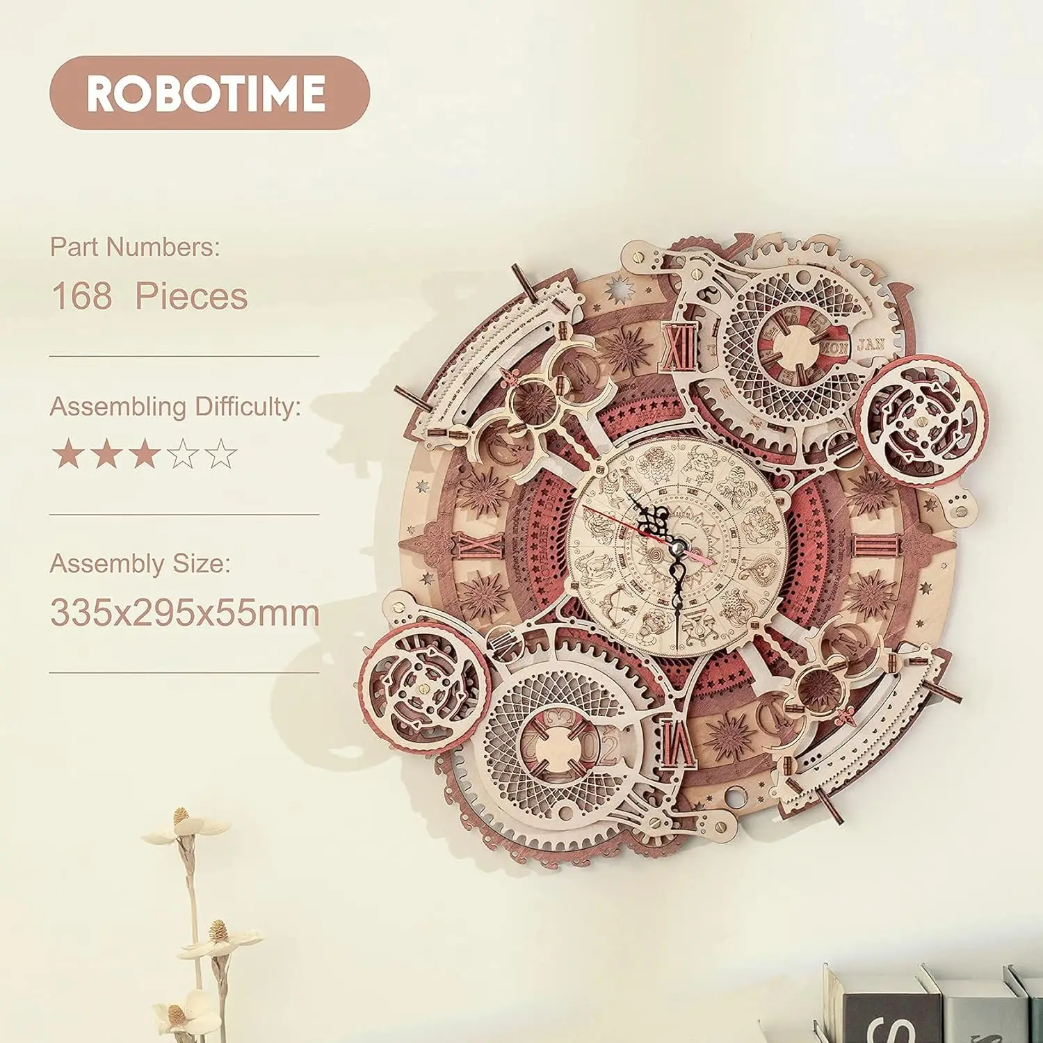 Ten zegar łączy przyjemność samodzielnego montażu z elegancją dekoracji w stylu vintage. Ponad 300 starannie wyciętych elementów z litej lipy składa się bez kleju, tworząc funkcjonujący mechanizm kwarcowy, który wyświetla godziny, datę, miesiąc, dzień tygodnia i znaki zodiaku.