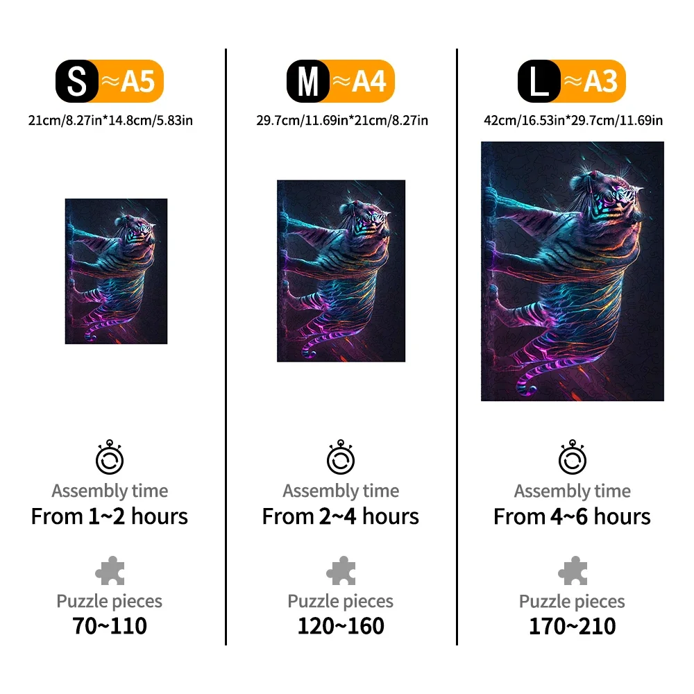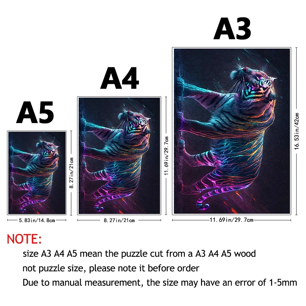 • Design: Wzór przedstawiający tygrysa w psychodelicznych barwach to połączenie piękna i wyzwania. Puzzle oferują nie tylko przyjemność z układania, ale również stają się ozdobą wnętrza.