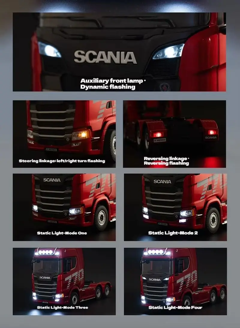 Wykonany z metalowych elementów, model wygląda jak prawdziwa ciężarówka. Skala 1:18 pozwala poczuć się jak w świecie prawdziwych pojazdów, a precyzyjnie zaprojektowane detale i realistyczna konstrukcja sprawiają, że model Scania 770S staje się nie tylko zabawką, ale i małym dziełem sztuki.